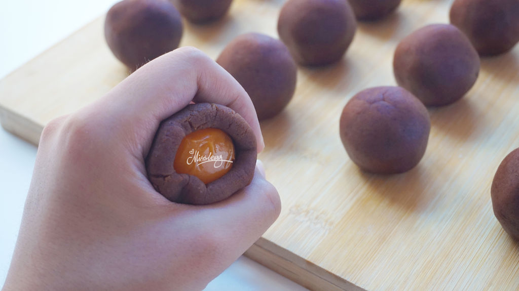 卵黄が冷めたら、あんこを25g/個作り、その中に卵黄を包み、丸めて置いておきます。