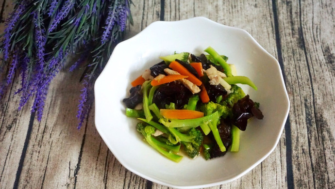 材料:ブロッコリーのスライス、ニンニクのみじん切り、豚肉の細切り、ニンジンのスライス、キクラゲ