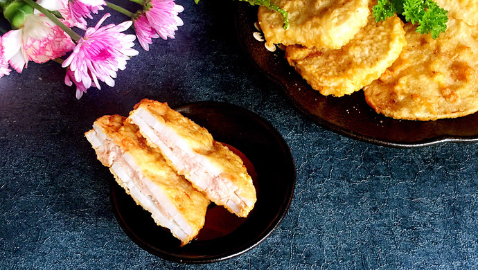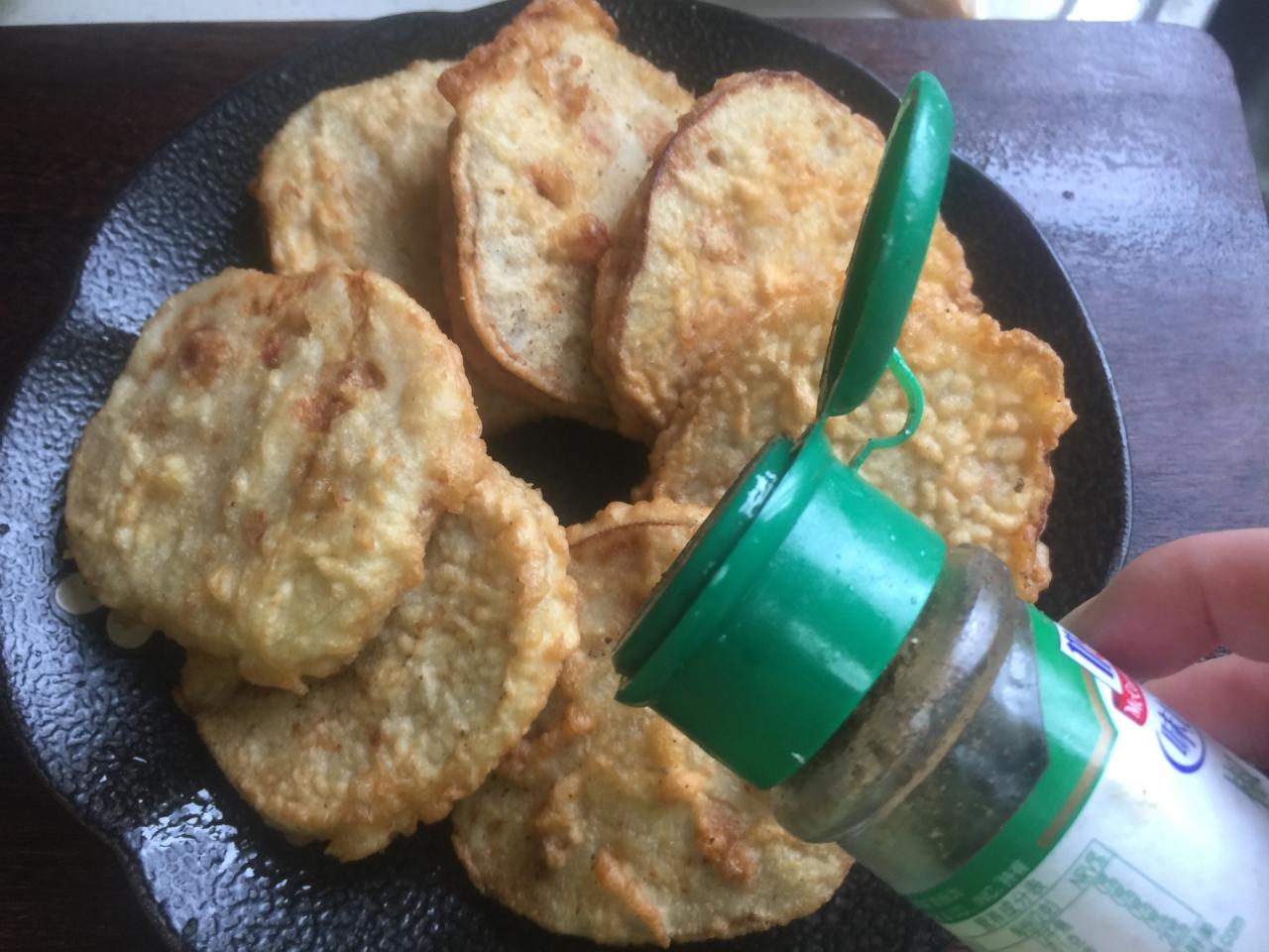 挟んだレンコンのスライスに揚げ衣をまぶす
