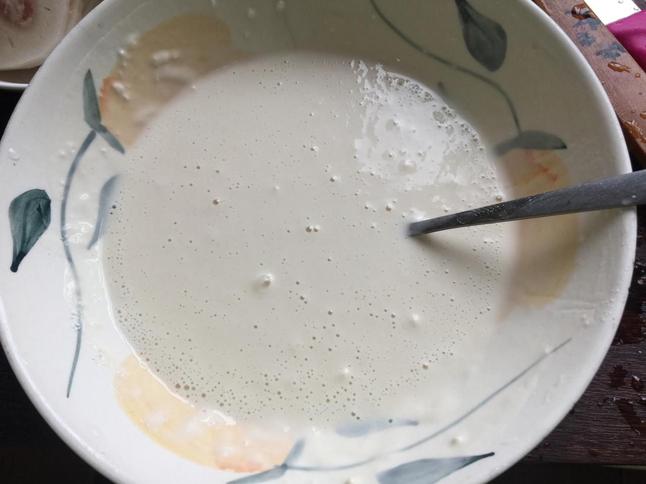 私が使った天ぷら粉は小麦粉と水の割合1:1.5でよく混ぜてペースト状にしても良いです。