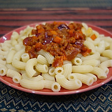 マカロニが調理されている間に、次の材料を準備します:適量の新鮮な豚ひき肉、玉ねぎ半分、みじん切り、皮をむいたトマト、トマトソース