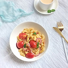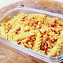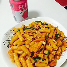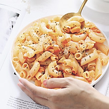 マカロニの上にソースを均等に注ぎ、みじん切りのネギを飾ります。