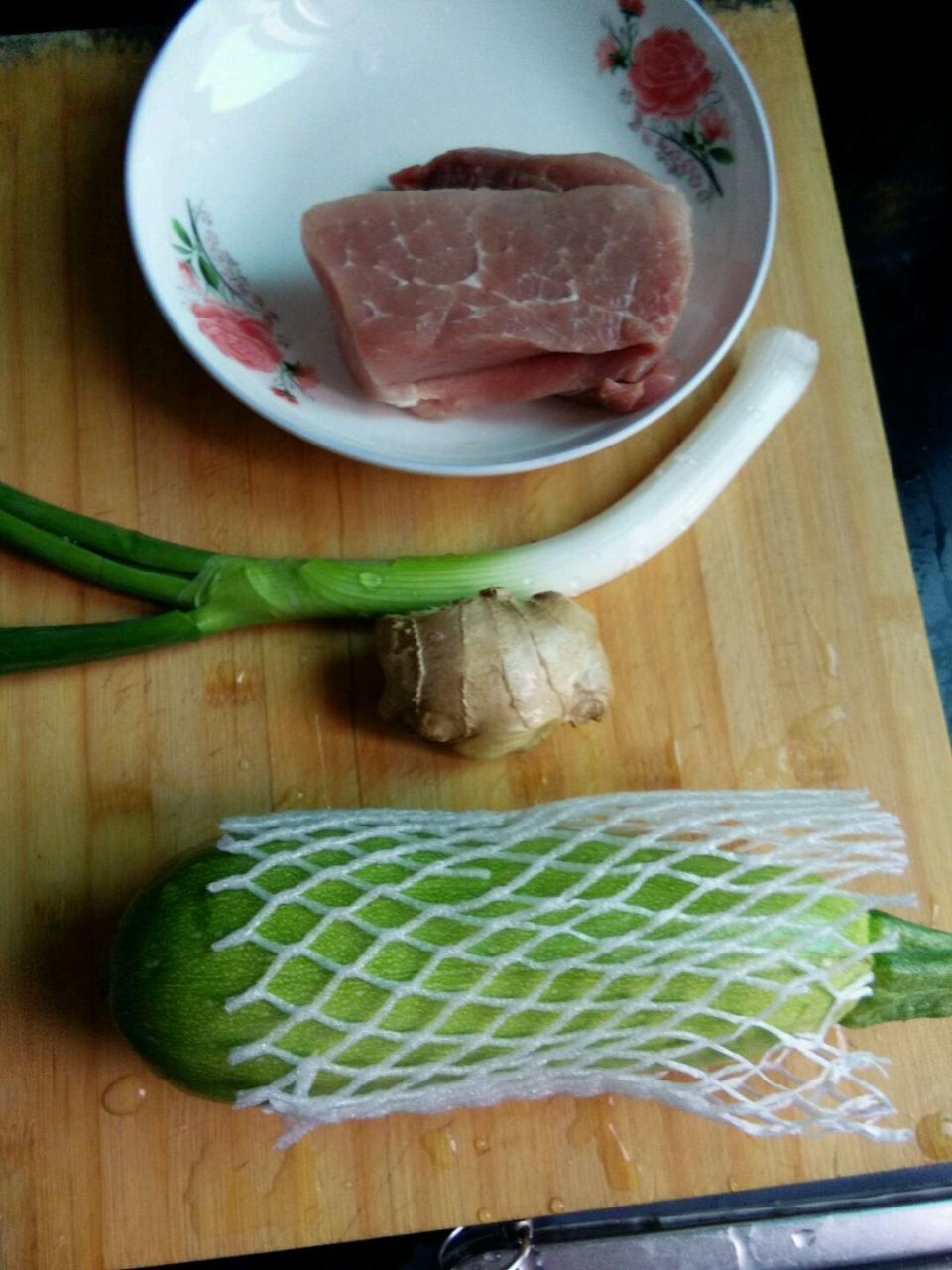 材料を用意します。 メロン 1個、赤身肉 適量、ネギ、生姜