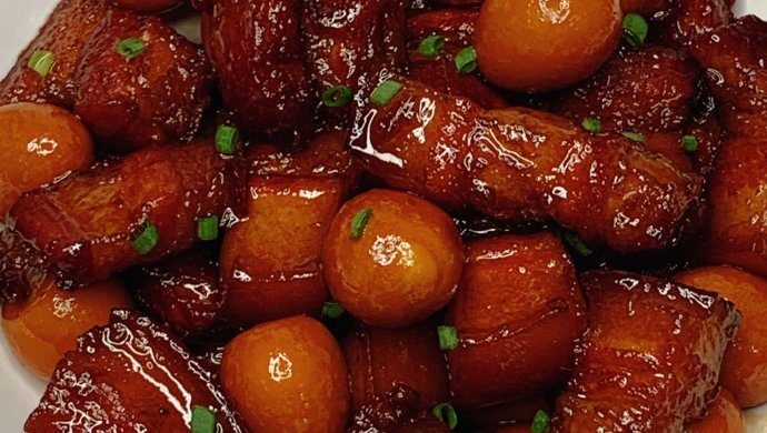 豚バラ肉を立方体に切り、ウズラの卵を茹でて皮をむき、鍋に入れて冷水に入れ、ネギを泡立つまで煮ます。油を加えずに弱火で両面が焼き色がつくまで炒め、氷砂糖を加えてカラメル色になるまで炒める。 2つのボウルに熱湯を注ぎます。