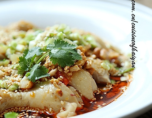 材料:冷やした鶏肉丸ごと3本 材料:茹でたピーナッツ、白ごま適量 調味料:生姜、ニラ、ラー油(赤油)、ロゼワイン少々。