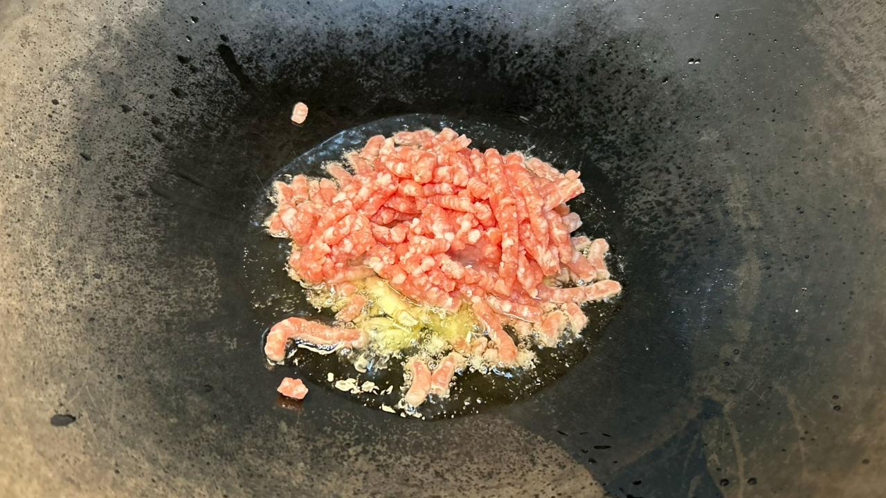 油を熱し、みじん切りにしたニンニクとひき肉を加えます
