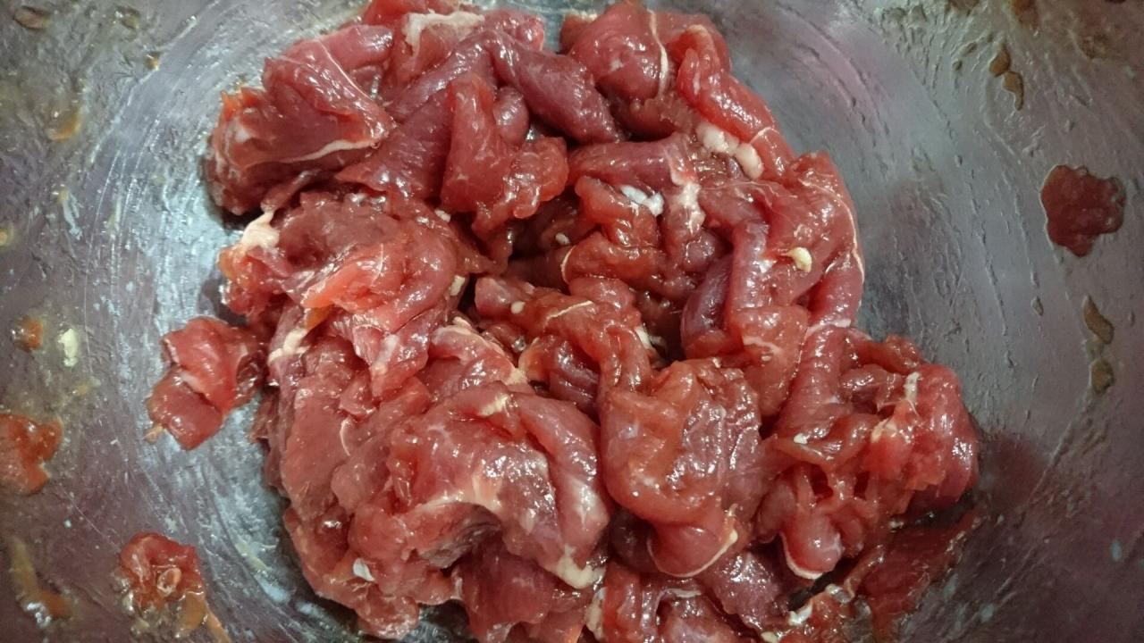 生臭みを消すために白ワインを5ml加えます。食用アルカリ1gを加えて牛肉を乾燥させます。