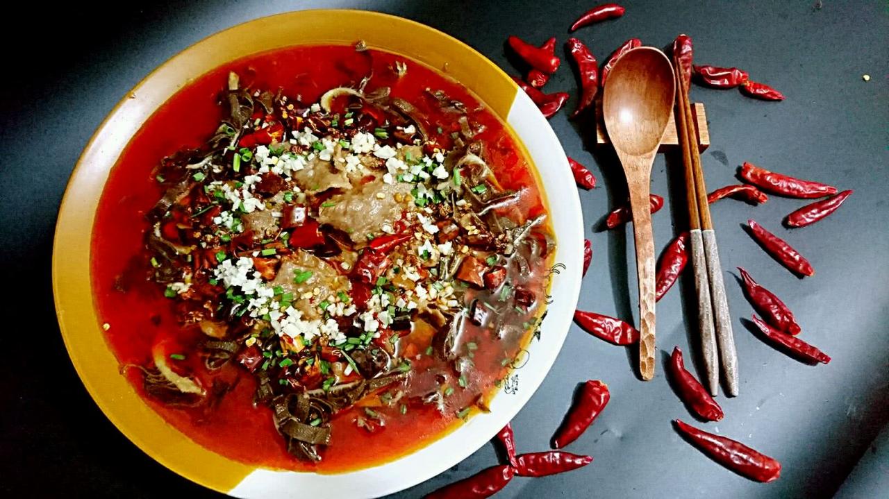 牛肉の周りに胃袋が置かれています。真ん中に揚げた乾燥唐辛子と花椒を散らすか、「揚げ唐辛子」を散らします。