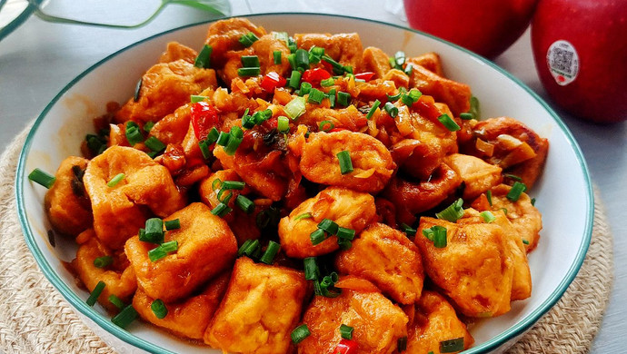 フライパンを予熱し、油を少々入れ、油の温度が7~8割になったら、豆腐を入れて皮がきつね色になるまで揚げます。