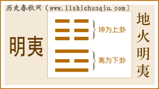 Ming Yi Guaは怪我と不運を象徴しています。李は太陽であり、明坤は地球です。太陽が沈むと光は地面に消え、明るい光になります。野蛮人は傷つきます。ミンイーは光のダメージを象徴します。闇の主は上におり、明の大臣は下におり、彼らはあえて知恵を示さないので、それが世界に闇をもたらします。光明がチームを迎えたとき、聖人は明徳にトラウマを抱えていたが、彼が直面した状況は非常に困難であり、自分の強さを隠して身を守ることしかできなかった。